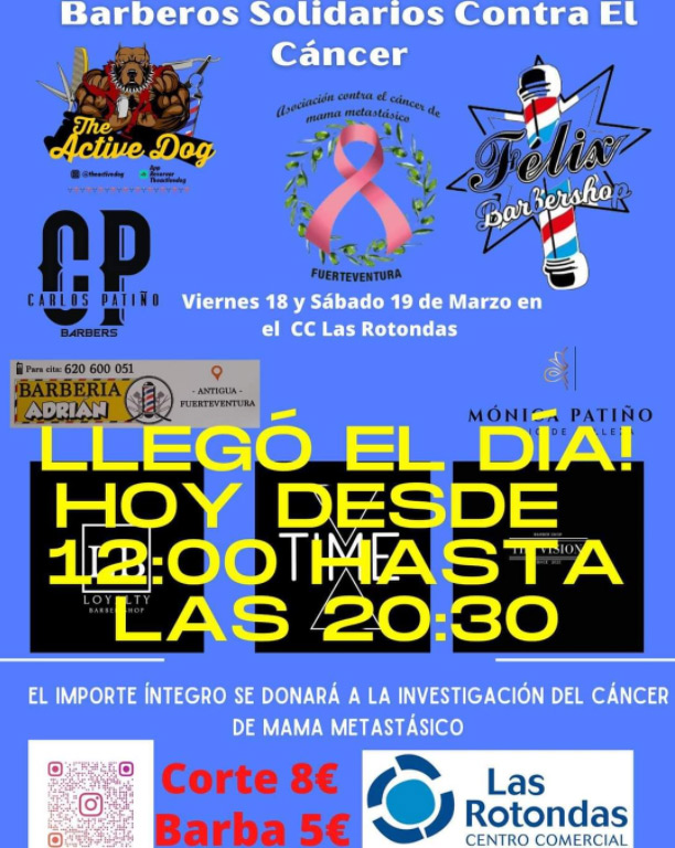 Nuevamente La Asociación del Cáncer de Mama Metastasico de Fuerteventura demuestra que tiene una gran iniciativa. Bajo el lema "Barberos solidarios contra el cáncer" en el Centro Comercial las Rotondas de Puerto del Rosario, y otros puntos de la isla, los barberos y empresarios del sector donan integramete a la Fundación Instituto Canario de Investigación del Cáncer todo lo recaudado entre los días 18 y 19 de Marzo de 2022. La suma total recaudada en esta ocasión es de 1.505 €.