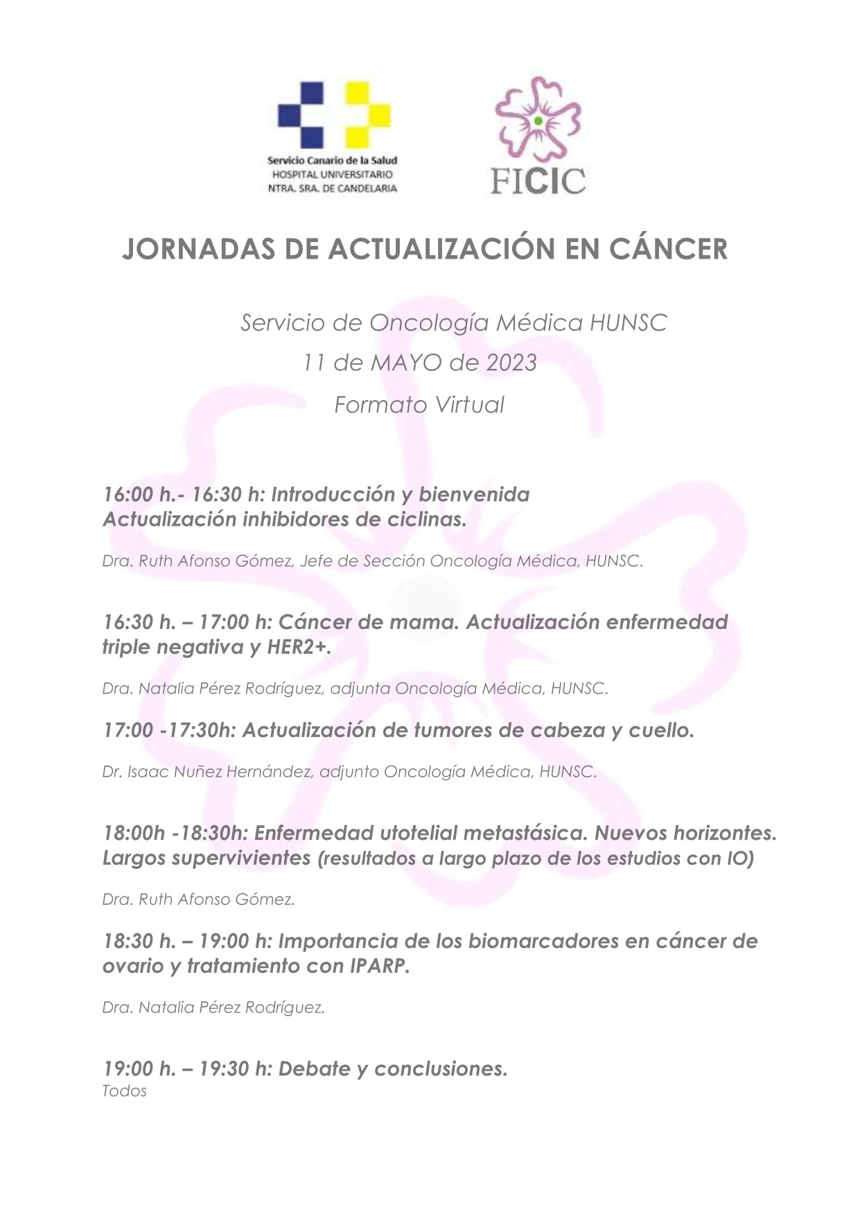 El Instituto Canario de Investigación del Cáncer coorganiza junto con la Asociación Canaria de Cáncer de Mama y Ginegológico, la ULPGC y la Universidad Fernando Pessoa Canarias, las XX Jornadas sobre Cáncer de Mama. Título: XX Jornadas sobre Cáncer de Mama. Lo que de verdad importa.