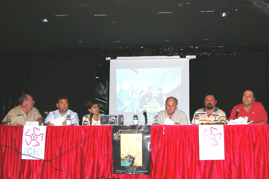 Ayala y Luna, nuevos premios Atlántico de Investigación del CáncerLa lista de premios Atlántico de Investigación del Cáncer cuenta con dos nuevos nombres que añadir a su panel de científicos que han dedicado su vida a la investigación y a la clínica del cáncer: Alberto Ayala y Mario Armando Luna. Sus méritos son inmensos, pues han capitaneado la Patología en el Hospital MD Anderson de Houston por décadas, contribuyendo a afianzar el prestigio de la institución con cientos de publicaciones científicas, y a formar decenas de patólogos de todos los países latinoamericanos. Sus biografías figurarán en breve en la sección de premios Atlántico de esta página web. Los nuevos Premios Atlántico de Investigación del Cáncer, Alberto Ayala y Mario Armando Luna (Foto de archivo, tomada en su anterior estancia en Fuerteventura, con ocasión de la I Conferencia Atlántica de Investigación del Cáncer) El Dr Luna, amigo inseparable y colega del Dr Ayala glosó su figura científica y humana para los presentes. Desgraciadamente en Dr Ayala no pudo asistir a la entrega del premio, debido a una desgracia familiar, por lo que el premio fue recogido por el Dr Luna de manos de la Dra Nubia Muñoz, Premio Atlántico de Investigación del Cáncer en 2004. Acto de presentación de los nuevos Premios Atlántico de Investigación del Cáncer 2005 La figura científica y humana del Dr Luna fue glosada por el Dr García-Tamayo, compañero y amigo por muchos años. El Dr Luna fue sorprendido por el acto, pues no conocía que iba a ser premiado, por lo que recibió con emoción el galardón de manos del Dr Blasco-Olaetxea. Pedro Lara y Nicolás Díaz Chico flanquean a los Premio Atlántico de Investigación del Cáncer, Mario Armando Luna (2005) y Nubia Muñoz (2004), acompañados de Eduardo Blasco-Olaetxea y Jorge García-Tamayo La nómina de premios Atlántico ha sufrido, desgraciadamente una baja. Se trata del Dr Dionisio González, primer canario premiado, que falleció el pasado 30 de junio. El Dr González, natural de La Laguna, Tenerife, ha sido un radioterapeuta mundialmente reconocido, que ejerció su profesión y su magisterio en la Universidad de Ámsterdam. El emocionado obituario corrió por cuenta del Dr Pedro Lara, que fue su discípulo en Holanda. El conjunto del acto resultó sencillo y emotivo para todos los presentes, y consolida una formidable nómina de importantes científicos que apoyan la novedosa estructura del ICIC, y apuestan por su consolidación como centro pionero de investigación del cáncer. |