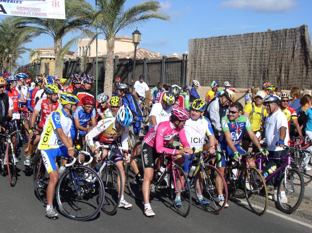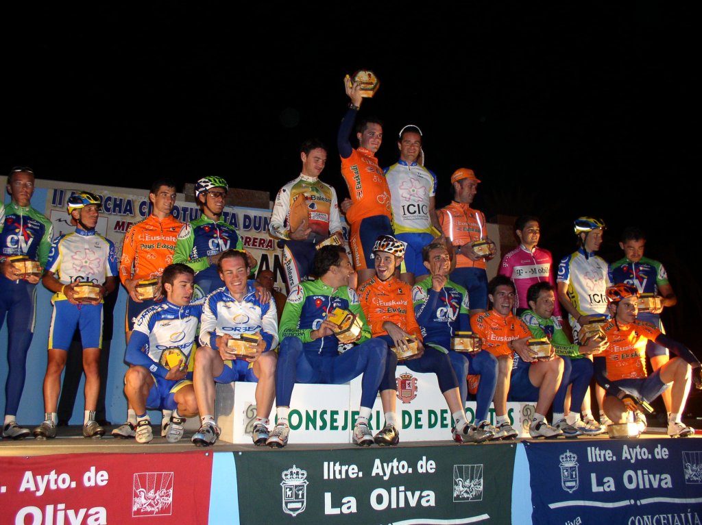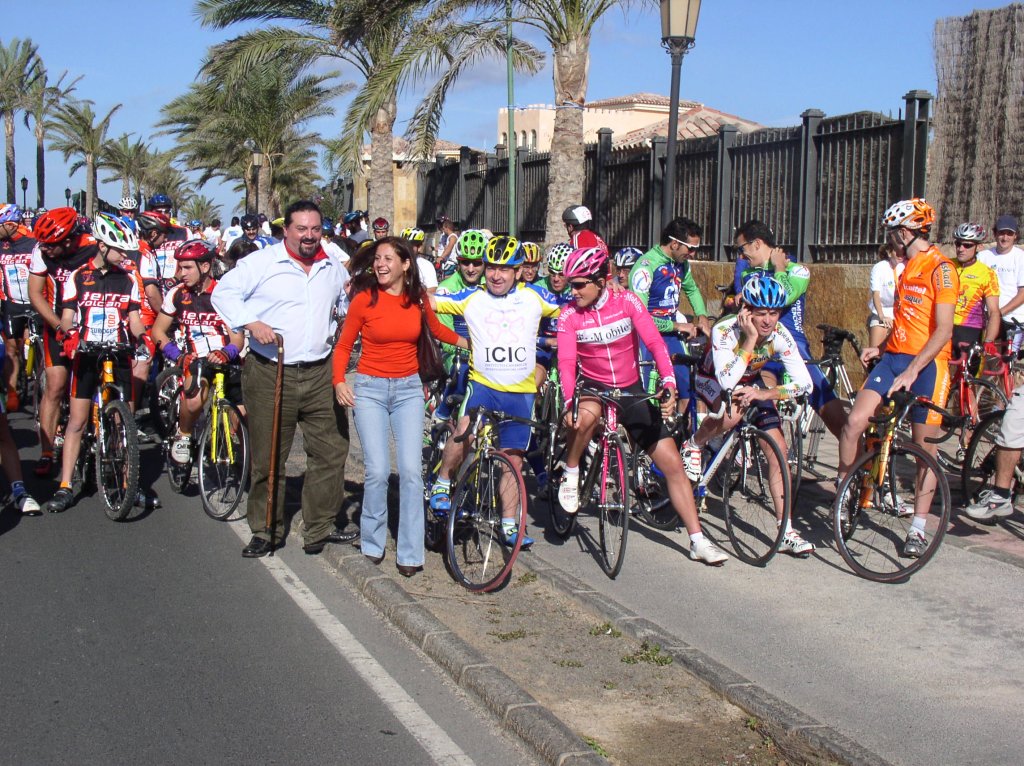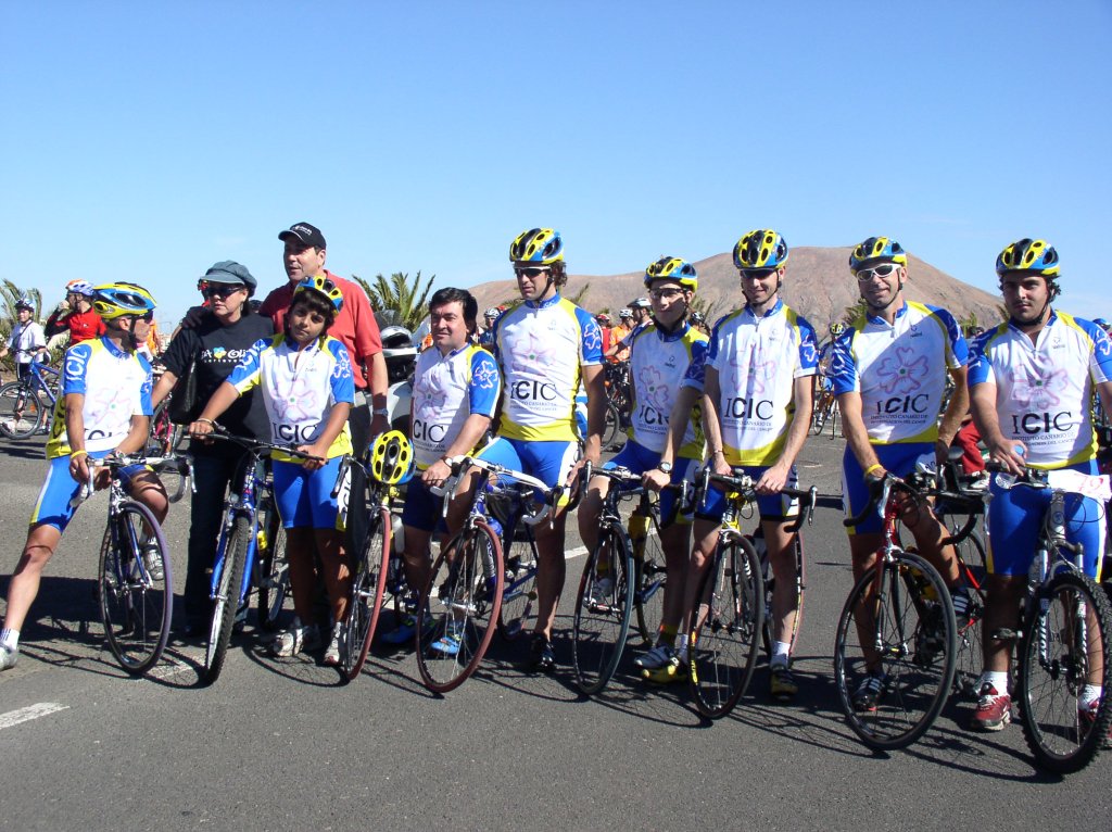5. II Marcha Cicloturista Dunas de Corralejo "Kilómetros contra el cáncer"Equipo del ICIC participante en la II Marcha Cicloturista Dunas de Corralejo Memorial Pilar Cabrera, consitutuido por Miguel de la Nuez, Eduardo Blasco Álvarez, Vicente Belda, Santos González, Sergio Cuesta y Santi Pérez. El objetivo original de las marchas cicloturistas organizadas por el ICIC ha sido concienciar a la población de que el deporte es importante para conservar una buena salud y prevenir la paga de la obesidad, que conduce, entre otras enfermedades, a una mayor predisposición del cáncer. Además, este año hemos vinculado la II Marcha Cicloturista Memorial Pilar Cabrera a la búsqueda de fondos en todos los frentes para la investigación del cáncer en el seno del ICIC. La II Marcha Cicloturista ha tratado de cubrir ese doble objetivo, y se ha propuesto captar fondos de la sociedad mediante el procedimiento de que los ciudadanos y las empresas adquieran "Kilómetros contra el cáncer" y colaboren con sus donativos en un almuerzo benéfico. Salida del Hotel Bahía Real de los 488 particpantes en la II Marcha Cicloturista Dunas de Corralejo. En primer término, Eduardo Blasco-Olaetxea y Claudina Morales, alcaldesa de La Oliva, junto a Vicente Belda, Óscar Sevilla. La II Marcha Cicloturista se celebró el domingo 4 de diciembre, y contó con 488 participantes, lo que constituyó un sonado éxito de participación y proporcionó un excelente efecto de promoción para la lucha contra el cáncer en Fuerteventura y en toda Canarias. La mayoría de los ciclistas fueron de Fuerteventura, pero hubo una nutrida representación de Lanzarote (más de 100 ciclistas) y de Telde (más de 50 ciclistas), que utilizaron la oferta de traslado gratuito a Fuerteventura ofrecida por la Línea Armas. Participaron 23 ciclistas profesionales pertenecientes a los equipos Euskaltel-Euskadi, Kelme-Comunitat Valenciana y Orbea, además de Santos González, Santi Pérez, Francisco Mancebo, Sergio Cuesta, Óscar Sevilla y otros que participaron individualmente. Estos equipos, junto a decenas de aficionados y personas concienciadas en la lucha contra el cáncer, conformaron en Corralejo un espectáculo multicolor difícilmente igualable. Oscar Sevila encabeza el pelotón frente a la isla de Lobos. Equipo de Lanzarote. La carrera constó de tres etapas, con un total de 47 km. La primera etapa transcurrió por terreno llano, entre el Hotel Bahía Real y el cruce de La Caldereta, de 20 km, y fue cubierta por casi todos los participantes. La segunda etapa tuvo lugar entre el citado cruce y a Casa de Los Coroneles, en La Oliva, de 10 km, con un puerto en La Caldereta, que propició algunos abandonos. La tercera etapa transcurrió entre La Oliva y la urbanización Tamaragua, de 17 km, y culminó con la llegada a la avenida principal de Corralejo en un sprint impresionante, con los ciclistas lanzados a toda velocidad por la avenida principal de Corralejo. Equipo del Comunitat Valenciana. Ciclistas de Telde ante la Casa de los Coroneles, en La Oliva Descanso en la Urbanización Tamaragua Tras la carrera hubo una fiesta popular organizada por el Ayuntamiento de La Oliva, con una comida típica. Durante la fiesta se sortearon bicicletas, material deportivo y regalos donados por empresas y particulares de Fuerteventura, verdaderos patrocinadores de la carrera. La fiesta terminó con la entrega de recuerdos a los ciclistas participantes por el Ayuntamiento de la Oliva al más veterano de los ciclistas, de origen italiano que ha participado en las dos ediciones de la Marcha Cicloturista Dunas de Corralejo. Salida de la segunda etapa. Llegada al sprint a Corralejo Distinción al cicloturista más veterano Premio Librería Tagoror a uno de los niños participantes Fiesta popular al final de la marcha La prueba ciclista final estuvo dedicada a los profesionales: un espectacular I Criterium Dunas de Corralejo, celebrado el 5 de diciembre. Los ciclistas profesionales corrieron en un circuito urbano de 1200 metros, al que daban 25 vueltas, con eliminación del último en cada vuelta. Los cinco últimos protagonizaron un potente sprint que hizo las delicias de los miles de personas congregadas en la avenida principal de Corralejo, que disfrutaron con los peculiares comentarios del sin par Vicente Belda. Entrega de premios en el Criterium Dunas de Corralejo: Markel Irizar, Paco Mancebo y Santos González. El Criterium fue ganado por Markel Irizar, ciclista del Euskaltel que ha padecido cáncer de testículo, y que se dejó la piel por la causa de la lucha contra el cáncer. El segundo clasificado fue Francisco Mancebo y el tercero es Santos González, que actualmente no tiene equipo, pero que será el líder del Comunidad Murciana, actualmente en constitución. Santos González, Vicente Belda, Sergio Cuesta, Santi Pérez, Miguel de la Nuez y otros ciclistas vistieron el maillot del ICIC, un regalo del equipo Comunitat Valenciana. La prueba fue de carácter oficial, presidida por el presidente de la Federación Ciclista de Las Palmas, que participó como ciclista en la II Marcha Cicloturista, y contó con jueces de la misma Federación. Comida benéfica y parranda contra el cáncer En Corralejo tuvo lugar también un almuerzo benéfico, en las magníficas instalaciones del Club Baku de Corralejo, al que asistieron 300 personas que contribuyeron con su donativo de 50 euros a la causa de la investigación del cáncer en Canarias. La comida, que incluyó platos típicos majoreros, como una excelente carne de cabra, estuvo amenizada por un soberbio grupo de folcloristas venidos de todas las islas, como los majoreros, como Domingo "El Colorao", Carlos Cabrera, Marcos Hormiga, Domingo Umpiérrez y Pancho González, miembros de la Parranda del Tío Paco, de Gran Canaria, que cuenta entre sus miembros con Feluco Tejera Alexis Santana, Goretti Benítez, Andrés García, Yeray Rodríguez, Mariví Cabo, Abelardo "El Tormento", Manolo Estupiñán y Moneiba G
