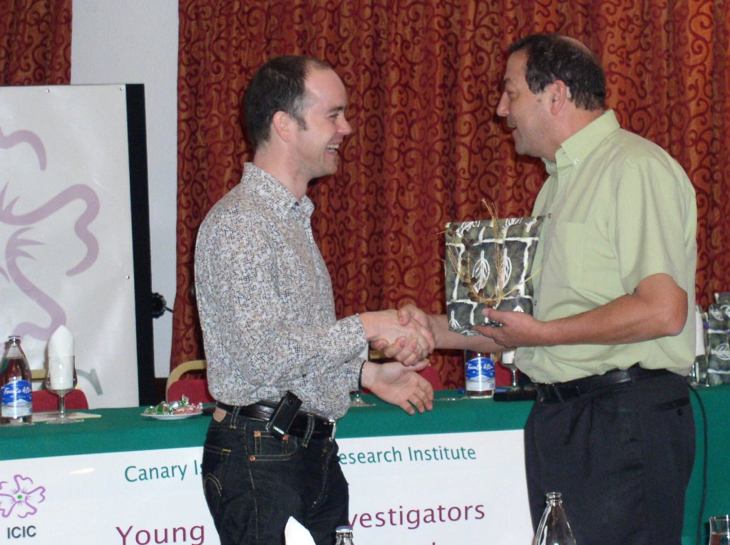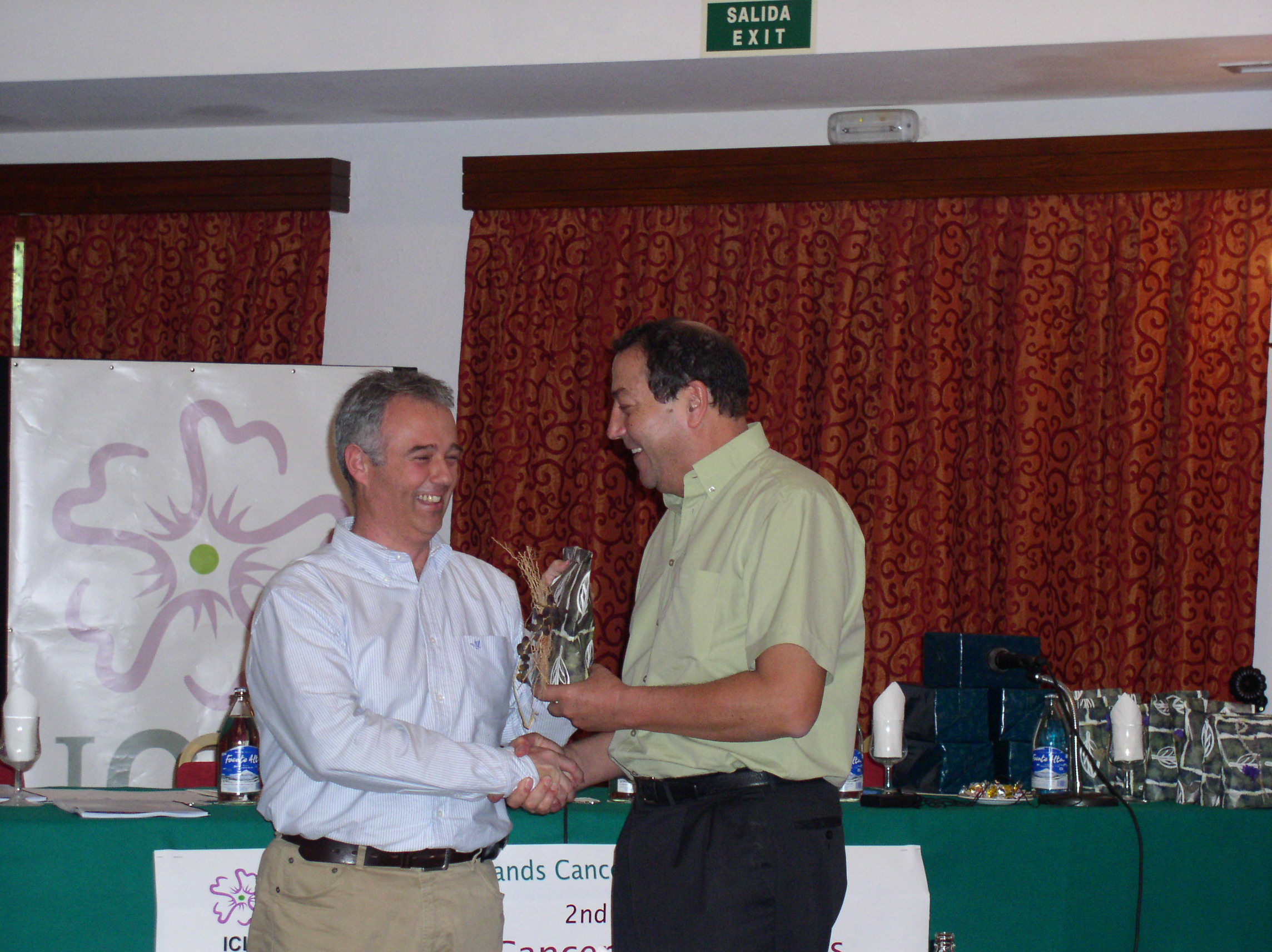 2. Resumen del 2nd Meeting of the Young Cancer Investigators of the Canary IslandsEl ICIC (Instituto Canario de Investigación del Cáncer) organizó el Second Meeting of the Young Cancer Investigators of the Canary Islands (2nd YCIC 2005) en el Hotel Tecina de La Gomera los días 17 al 20 de Diciembre, que ha resultado todo un éxito científico. Comenzó con el acto inaugural presidido por el Rector de la Universidad de La Laguna, Exmo Sr D Ángel Gutiérrez, y co-presidido por la Consejera de Asuntos Sociales del Cabildo de La Gomera, Ventura del Carmen Rodríguez Herrera. La mesa inaugural incluyó a las consejeras de asuntos sociales de los ayuntamientos de Valle Gran Rey y de San Sebastián, el Presidente de la Comisión Científica de la FICIC, Sergio Moreno y el director del ICIC Nicolás Díaz Chico. Inauguración del 2nd YCIC. La mesa estuvo integrada por la Consejera de Asuntos Sociales de Valle Gran Rey, el presidente de la Comisión Científica del ICIC, Sergio Moreno, el rector de la Universidad de La Laguna, Ángel Gutiérrez, la Consejera de Asuntos Sociales del Cabildo de La Gomera, Ventura del Carmen Rodríguez Herrera, el director del ICIC, Nicolás Díaz Chico y la Consejera de Asuntos Sociales del Ayuntamiento de San Sebastián. Desde 2004, el programa de becas del ICIC ya obligaba a los becarios a realizar una presentación oral de sus resultados en inglés, superando en exigencia en cuanto la rendición de cuentas a las becas del Ministerio, de la Comunidad Canaria o de otras agencias, que normalmente sólo obligan a enviar una memoria anual, cuyo destino es incierto. Este año, con ocasión del 2st YCIC, nuestros becarios han dado ejemplo de seriedad, autoexigencia, rigor y superación importante, que les ha llevado a superar las ya elevadas cotas del año pasado. Elisa Pérez Sacau, becaria doctoral, durante su presentación. Carlos Mateos durante su presentación Durante el 2nd YCIC, los becarios del ICIC presentaron un resumen de sus proyectos científicos, pues el acto ha sido pensado para facilitar la colaboración entre ellos y de recibir las críticas constructivas que puedan ayudarles en el desarrollo de los actuales y futuros proyectos. Las presentaciones se ajustaron al programa definitivo previsto y fueron seguidas con atención por los participantes y por los miembros de la Comisión Evaluadora Externa, que resultó atractiva por el intercambio de opiniones y las sugerencias a los becarios. Este año hubo menos dificultades con el inglés, y el nivel de las respuestas de los becarios fue comparable al que se observa en encuentros científicos internacionales con participación de científicos cuya lengua materna no es el inglés. Sesión de pósteres: Yurena Rodríguez discute su póster con Raquel Díaz Peñate. Alfredo Carrato y Miguel Fernández Braña durante la sesión de pósteres, a cuya finalización se sirvió queso y vino cortesía del Ayuntamiento de Agulo. La sesión de pósteres también superó en cantidad y calidad las del año 2004, lo cual es altamente satisfactorio y nos anima a seguir luchando por la creación de la cantera que dará los nuevos valores a la investigación del cáncer en Canarias. Rafael Zárate (I) recibe un regalo por su participación de manos de Nicolás Díaz Chico. La ponencia del ICIC estuvo a cargo de Rafael Zárate, biotecnólogo asociado al ICIC desde su fundación, que presentó con brillantez su trabajo sobre modificación de plantas con genes que codifican enzimas de interés para la biotransformación de compuestos de interés farmacéutico. Tony Kouzarides y Bodo Stern reciben sendos recuerdos por su participación en el 2nd YCIC. Federico Gago durante su disertación Ponentes invitados: Sergio Moreno, Bodo Stern, Tony Kouzarides, Federico Gago y Rafael Zárate al finalizar las sesiones. Como ilustres invitados participaron este año Tony Kouzarides (Cambridge, Reino Unido), descubridor del código de histonas y de su implicación en la regulación de la expresión génica, Bodo Stern (editor de la revista Cell, quizás la más importante en el campo de la Biomedicina), que disertó sobre la manera en la las revistas de élite gestionan los manuscritos científicos, Federico Gago (Universidad de Alcalá de Henares) que presentó una revisión de los aspectos básicos en el campo de la modelización de moléculas dirigidas a dianas terapéuticas, y Alfredo Carrato (Jefe del Servicio de Oncología Médica Hospital Universitario de Elche y Presidente de la Sociedad Española de Oncología Médica, SEOM), que abordó el creciente papel de los polimorfismos en el diagnóstico y tratamiento del cáncer. Sergio Moreno explica el significado de los premios concedidos a las mejores ponencias. A su lado José Manuel Padrón, primer premio, Tony Kouzarides y Bodo Stern que flaquean a Elisa Pérez Sacau y Raquel Díaz Peñate, quienes recibieron los segundos premios, junto a Federico Gago y Nicolás Díaz Chico. La dirección del ICIC otorgó este año tres premios a las mejores contribuciones al 2nd YCIC. El primer premio, dotado con 1,000 € recayó en la interesante presentación de José Manuel Padrón, becario doctoral del ICIC. Los segundos premios, dotados con 500 € cada uno recayeron en Elisa Pérez Sacau (que ya había sido premiada en la 2ª Conferencia Atlántica del Cáncer) y en Raquel Díaz Peñate, ambas becarias posdoctorales del ICIC. Este año se la elección del Hotel Tecina fue un acierto pues tiene unas instalaciones muy apropiadas para realizar este encuentros que no sean demasiado numerosos, y dispone de preciosas habitaciones con vistas al mar. El tiempo no acompañó en esta ocasión, pues se desató una tormenta que impidió la prevista caminata al Monte del Cedro en el Parque Nacional Garajonay, y complicó el regreso de los participantes por cierre del aeropuerto. El 2nd YCIC ha contado con el apoyo del Cabildo de La Gomera, que nos ha ofrecido los medios de transporte, sus bellas ins