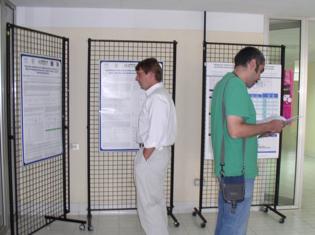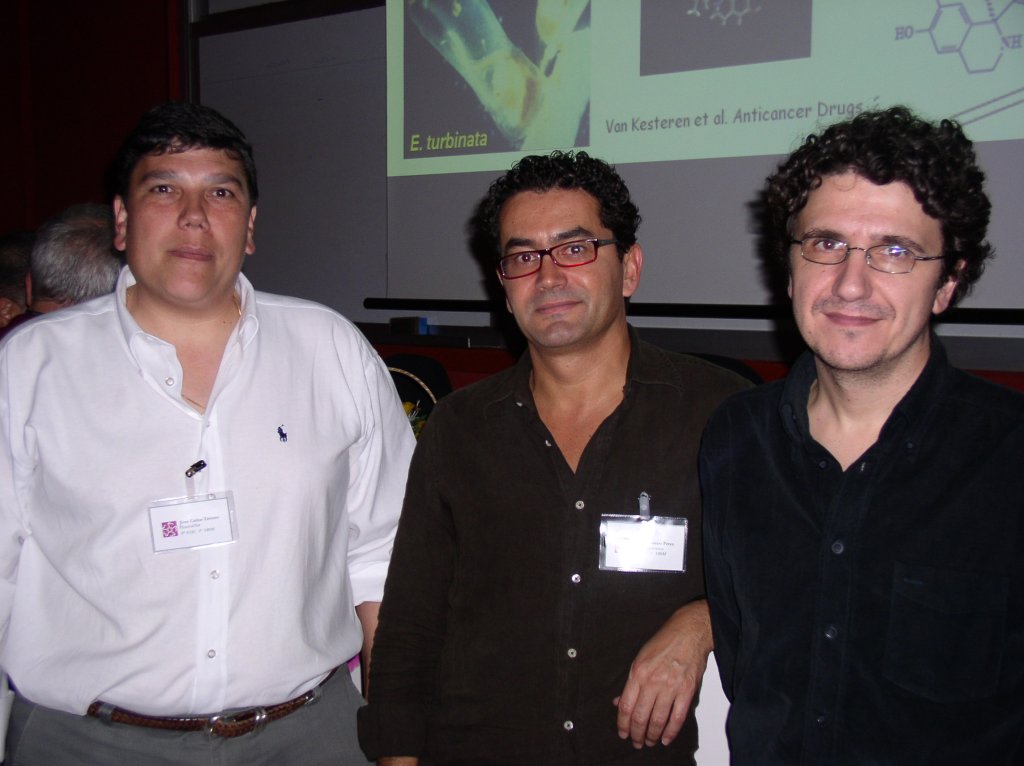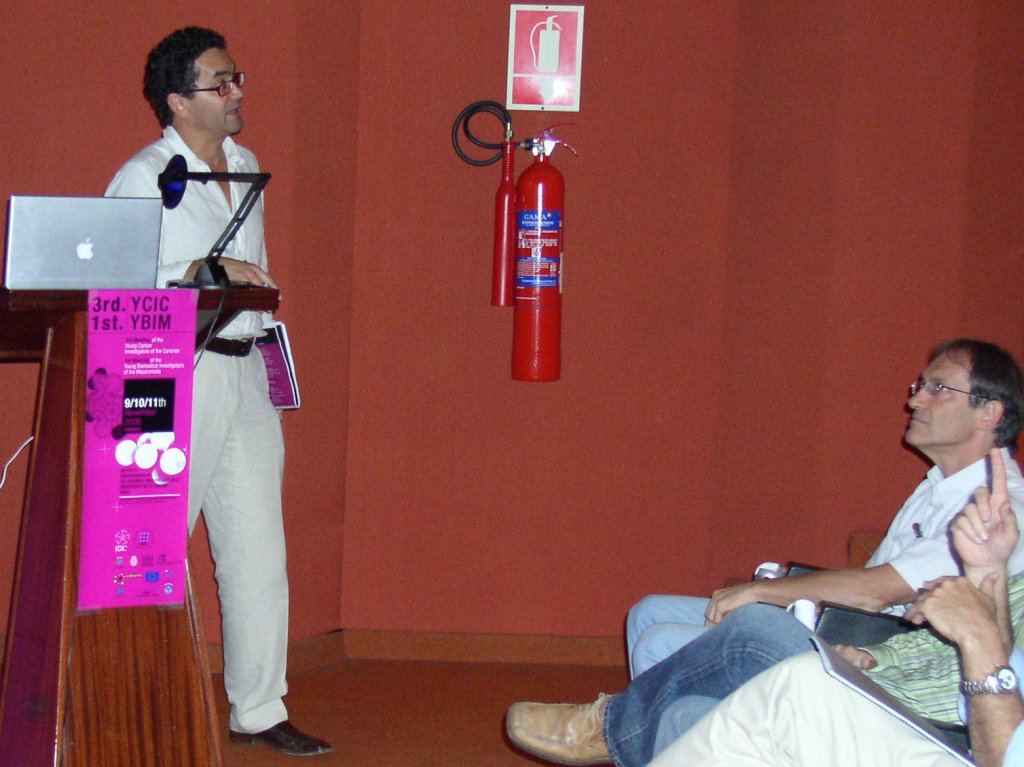 3. III Young Cancer Research Investigators Meeting 2006Inauguración del III YCIC / I YBIM, con Rafael Zárate, Nicolás Díaz Chico, Sergio Moreno y José M. Padrón Como ya ocurrió en las ediciones previas, el III YCIC congregó en La Laguna a los investigadores jóvenes del ICIC con sus respectivos directores y ante un elenco de investigadores de talla mundial: Sergio Moreno (Centro de Investigación del Cáncer, Salamanca), Marcos Malumbres y James A. Bischoff (Centro Nacional de Investigaciones Oncológicas, Madrid), Antonio Casado (Hospital de San Carlos, Universidad Complutense, Madrid), Juan Carlos Tercero (Pharmamar, Madrid) y Jiri Bartek (Instituto Danés de Biología del Cáncer). La primera sesión "Tumor genomics and markers" tuvo como moderadores a Juan C. Díaz Chico y Jiri Bartek, y participaron como ponentes los investigadores del ICIC Cristina Bilbao, Raquel Ramírez, Germán Rodríguez, Ana González y Elisa Bordón, que presentaron sus últimos resultados sobre genómica del cáncer. La segunda sesión "Experimental and biomedical Research" tuvo como moderadores a Pedro Lara and Sergio Moreno, y como ponentes a los investigadores del ICIC Guayarmina Hernández, Luis Henríquez, Dionisio Villegas y Cecilia Guzmán, que abordaron desde los contaminantes y el cáncer hasta patología molecular de los tumores. Ponentes invitados III YCIC / I YBIM. Juan C. Tercero, Sergio Moreno y Marcos Malumbres La tercera sesión estuvo dedicada a los primeros tres profesores invitados, Sergio Moreno, que habló de mecanismos de acción de nuevos antitumorales, Juan Carlos Tercero, sobre los mecanismos de acción y la farmacogenómica del Yondelis y Marcos Malumbres sobre modelos animales en oncología, que constituyeron un auténtico festín científico, que se prolongó por más de cinco horas. El viernes comenzó con la cuarta sesión dedicada a "Antitumor Compounds", moderada por Ángel Ravelo and Jim Bischoff, y tuvo como ponentes a los investigadores del ICIC Patricia Cruz López y José M. Padrón, que presentaron sus resultados sobre aislamiento de nuevos antitumorales y estudios de actividad citotóxica. En esta sesión participaron también los ponentes invitados Manuel Fernándes, de la Universidad de Madeira, que presentó un estudio de modelización in silito de nuevos antitumorales específicos de dianas moleculares, y Enma Carmelo Pascual, del Instituto de Enfermedades Tropicales, que presentó sus resultados sobre segregación de DNA en bacterias. Participantes en las sesiones de la mañana: Francisco Navarro, Víctor Martín y José Quintana La quinta sesión fue moderada por Víctor S. Martín y Marcos Malumbres, y estuvo dedicada a investigadores de Biomedicina que colaboran ocasionalmente con Francisco Navarro (Universidad de La Laguna), que habló sobre transporte de nitrógeno en levadura, Félix Machín (Unidad de Investigación del Hospital de La Candelaria) sobre DNA ribosomal, y José Quintana (Universidad de Las Palmas) que habló sobre efectos antitumorales de la melatonina. Todos ellos dejaron patente el impresionante potencial investigador que atesoran las universidades e instituciones participantes. Sesión de pósteres, con Jim Bishop (I) estudiando uno de ellos La sesión de pósteres en esta edición estuvo muy concurrida, con 22 presentaciones. Su contenido fue muy diverso, con predominio neto de los estudios de la actividad antitumoral de nuevos compuestos naturales y sintéticos. Sergio Moreno (I) presenta a Jiri Bartek (D) La tarde del viernes estuvo dedicada a los tres ponentes invitados restantes, James Bischoff que presentó sus investigaciones sobre el descubrimiento y potencial diana terapéutica de las aurora quinasas, Antonio Casado, que puso al día los tratamientos endocrinos del cáncer de mama y Jiri Bartek sobre mecanismos de daño y reparación del DNA. El conjunto de las presentaciones resultó espectacular. Vista parcial de la sala de conferencias durante el III YCIC / I YBIM La última sesión científica fue dedicada a un encuentro entre los jóvenes investigadores de la Macaronesia que estudiaron diferentes posibilidades de colaboración entre los grupos de investigación a los que pertenecen. Los avances más importantes se han producido en la puesta en común de proyectos para el estudio de nuevos antitumorales y la actividad farmacológica en otras especialidades de los nuevos compuestos, muchos de ellos obtenidos de la rica biodiversidad macaronésica. También se profundizó en el conocimiento de los recursos existentes para realizar estudios de estructura-actividad farmacológica y en descubrimiento de nuevos antitumorales y el desarrollo y mejora de las actividades de los mismos. |