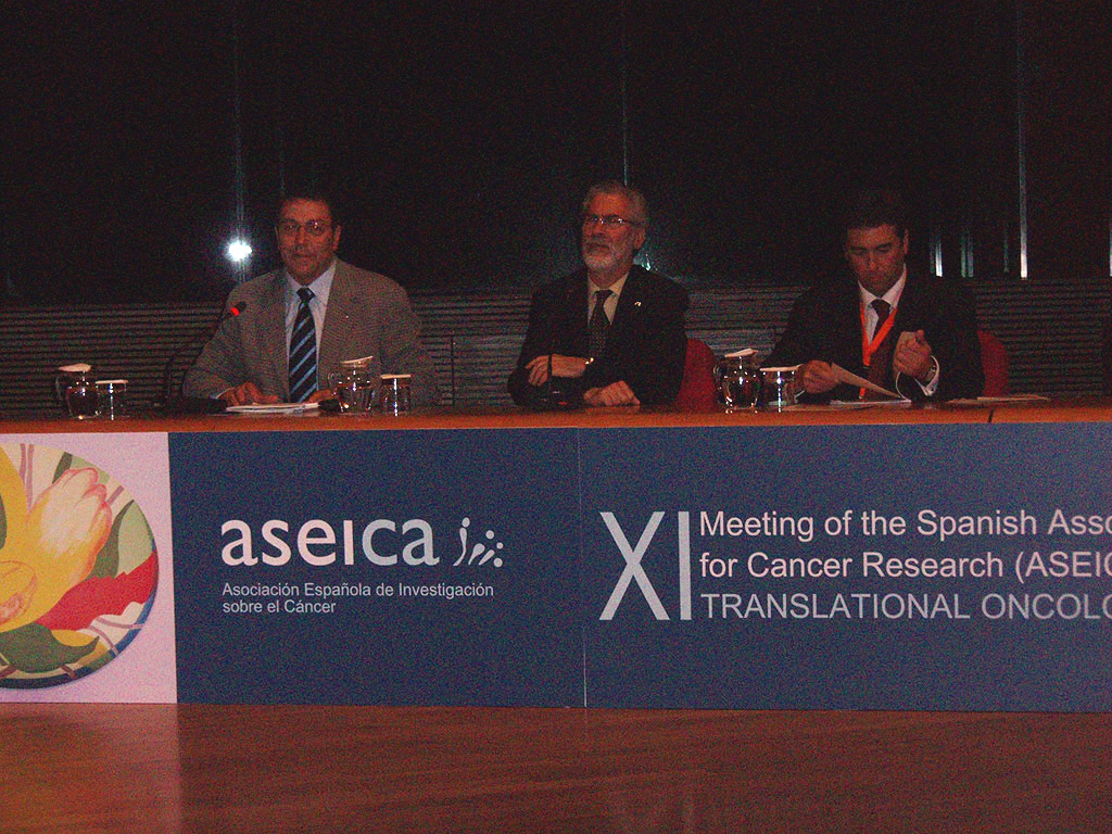 6.- XI Meeting de ASEICALos días 10 al 12 de mayo se celebró en Las Palmas el XI Meeting de ASEICA (Asociación española de Investigación sobre el Cáncer), que congregó a 440 investigadores de España, Europa y los EE UU AA. El Congreso fue organizado por la Fundación ICIC, teniendo en Nicolás Díaz Chico (Presidente de ASEICA y Director del ICIC), Pedro C. Lara (Presidente del Comité Organizador), Francisco Puertas (Tesorero), Marta Lloret, Beatriz Pinar y Marianne Vanderkrabben a sus principales protagonistas organizativos. Foto 58.7. Acto de Canarias Contra el Cáncer en el XI Meeting ASEICA El programa del Meeting fue realmente extraordinario (verlo en www.aseicameeting.com.), y se desarrolló enteramente en inglés. La colaboración con varias sociedades (SEOM, AERO, SESPMA, AECR y ASCOM) posibilitó alcanzar tan alto nivel científico para una sociedad con escasos recursos. Varios investigadores del ICIC tuvieron ponencias y presentaciones orales, dejando alto nuestro pabellón desde el punto de vista científico. Foto 58.8. Clausura del XI Meeting de ASEICA con el rector de la ULPGC José Regidor El Meeting incluyó una importante parte social, en un acto que puso el colofón a los realizados en el Club de Prensa Canaria en el proyecto Canarias Contra el Cáncer. En este acto, denominado Arte y Cáncer, el actor Sancho Gracia, el pintor José Dámaso, la presidenta de la Asociación Canaria de Cáncer de Mama Marisa Herrera, y la diputada regional María Australia Navarro hablaron de la influencia del cáncer en sus carreras, magistralmente conducidos por Pedro C. Lara y Javier Anido. Durante el Meeting se llevaron a cabo varias actividades, como la reunión de los investigadores participantes en el proyecto BIOPOLIS, que se describe más arriba, y una sesión conjunta con la Zona Especial Canarias sobre emprendeduría en Biotecnología. También se produjeron interesantes contactos entre los investigadores españoles y los ilustres científicos que participaron en el evento. El Meeting se celebró en el Auditorio Alfredo Kraus, que resultó una sede magnífica para este tipo de eventos, e hizo las delicias de los visitantes. El Meeting resultó un éxito científico y de organización, superando al ya mítico V Congreso de ASEICA, organizado por las mismas personas en 1993. |