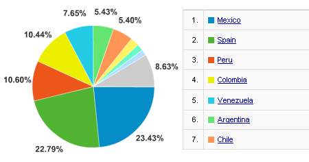 El análisis porcentual de visitas por países muestra que México es el país que más visitantes aporta con un 23,43%, le sigue España con un 22,79%. Entre estos dos países aportan casi el 50% de los visitantes. Les siguen Perú (10,6%), Colombia (10,44%) y Venezuela (7,65%) y resto de países de Latinoamérica.