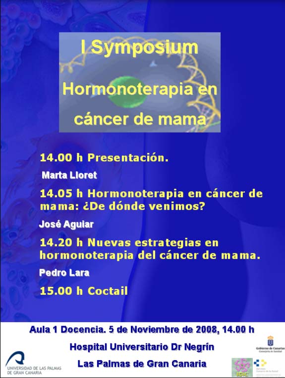 4. I Symposium de Hormonoterapia en Cáncer de MamaFoto 66.4. Portada del tríptico del I Symposium de Hormonoterapia en Cáncer de Mama La puesta al día de la terapia hormonal del cáncer de amma será tratada en un symposium el día 5 de noviembre en el Hospital Dr Negrín de Las Palmas de Gran Canaria. El acto es organizado por los doctores Pedro Lara y José Aguiar, y al mismo están invitados todos los profesionales relacionados con el tratamiento del cáncer de mama. Quienes deseen participar deben contactar vía email con la Dra Marta Lloret, en mllosae@hotmail.com. |