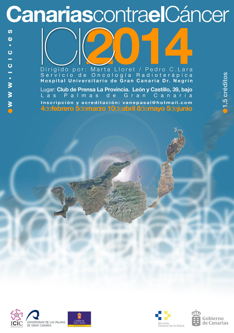 El próximo miércoles 13 de febrero, a las 19:00 h, en el Club de Prensa Canaria, calle de León y Castillo, comienza un nuevo programa anual de Canarias Contra el Cáncer, que alcanza su edición nº 11. El programa está dirigido por las Dras Marta Lloret, Laura García y Beatriz Pinar, y se impartirá los días 13 de febrero, 6 de marzo, 10 de abril, 8 de mayo y 5 de junio. Intervendrán destacados profesionales e investigadores (ver programa). Organizado por el Instituto Canario de Investigación del Cáncer, el Servicio canario de Salud (Servicio de Radioterapia del Hospital Universitario de Gran Canaria Dr Negrín), la Universidad de Las Palmas de Gran Canaria, y la Universidad Fernando Pessoa, cuenta con el apoyo y patrocinio del Cabildo Insular de Gran Canaria.